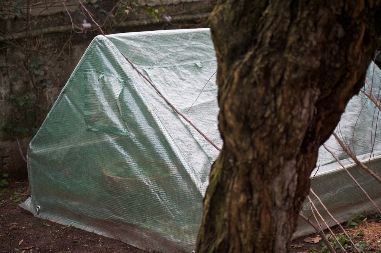 Depois montei um estufim que tinha por aqui. Parece uma tenda canadiana e se me lembro, a primeira vez que o montei há anos, voou pelos ares. E ficou guardado até este Sábado, com os tubos meio torcidos. Montar sem instruções demorou tempo e não entendi a necessidade de tubos com tantos tamanhos diferentes. Em vez de quatro tamanhos eu fazia o mesmo com um tubo genérico para todas as partes. Mas pronto, está montado.